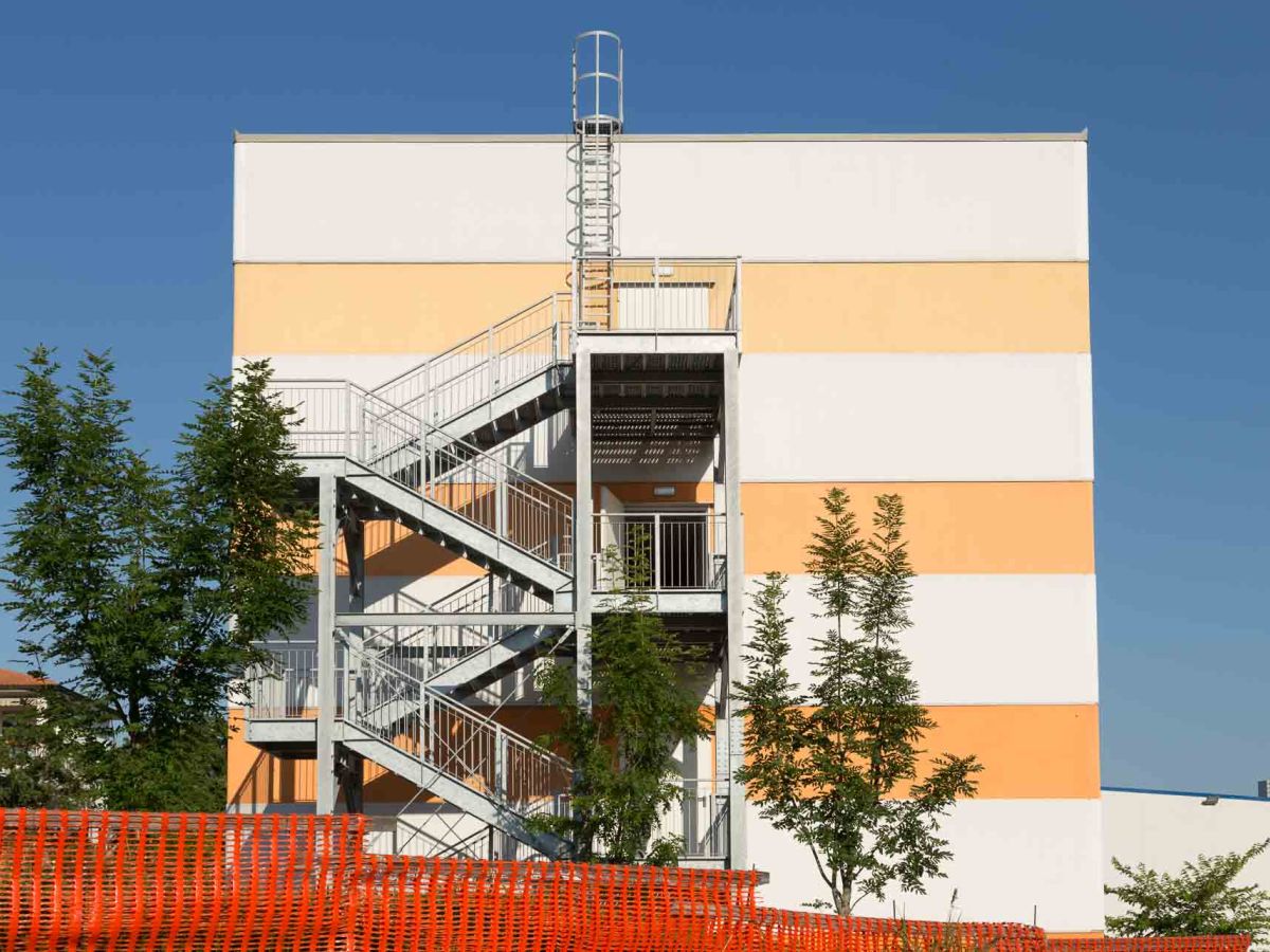 I collegamenti verticali (scala e ascensore) sono posizionati in testata all’edificio e sono realizzati in c.c.a. gettato in opera; tale parte della costruzione è rivestita con elementi U-glass installati su struttura metallica.