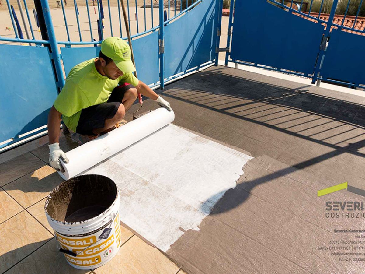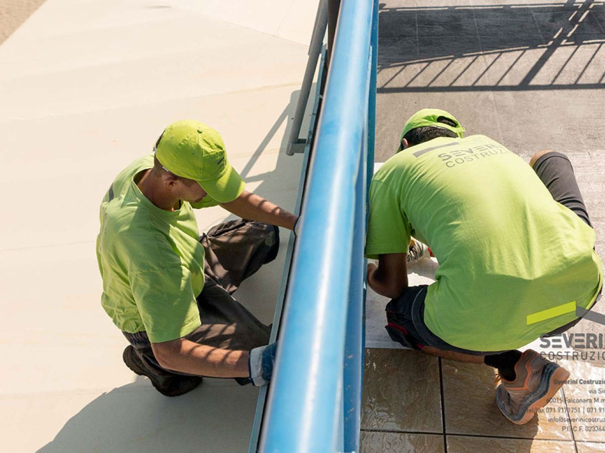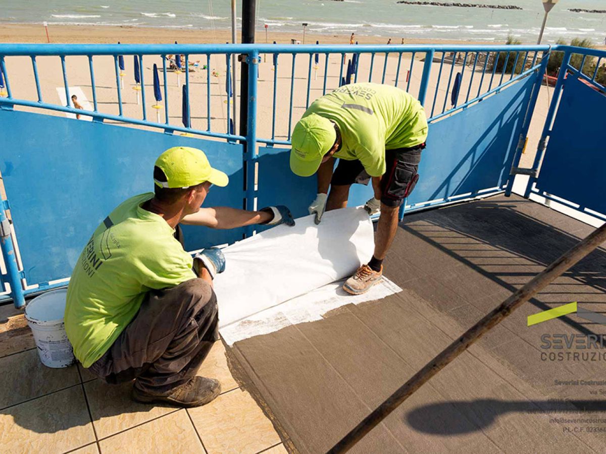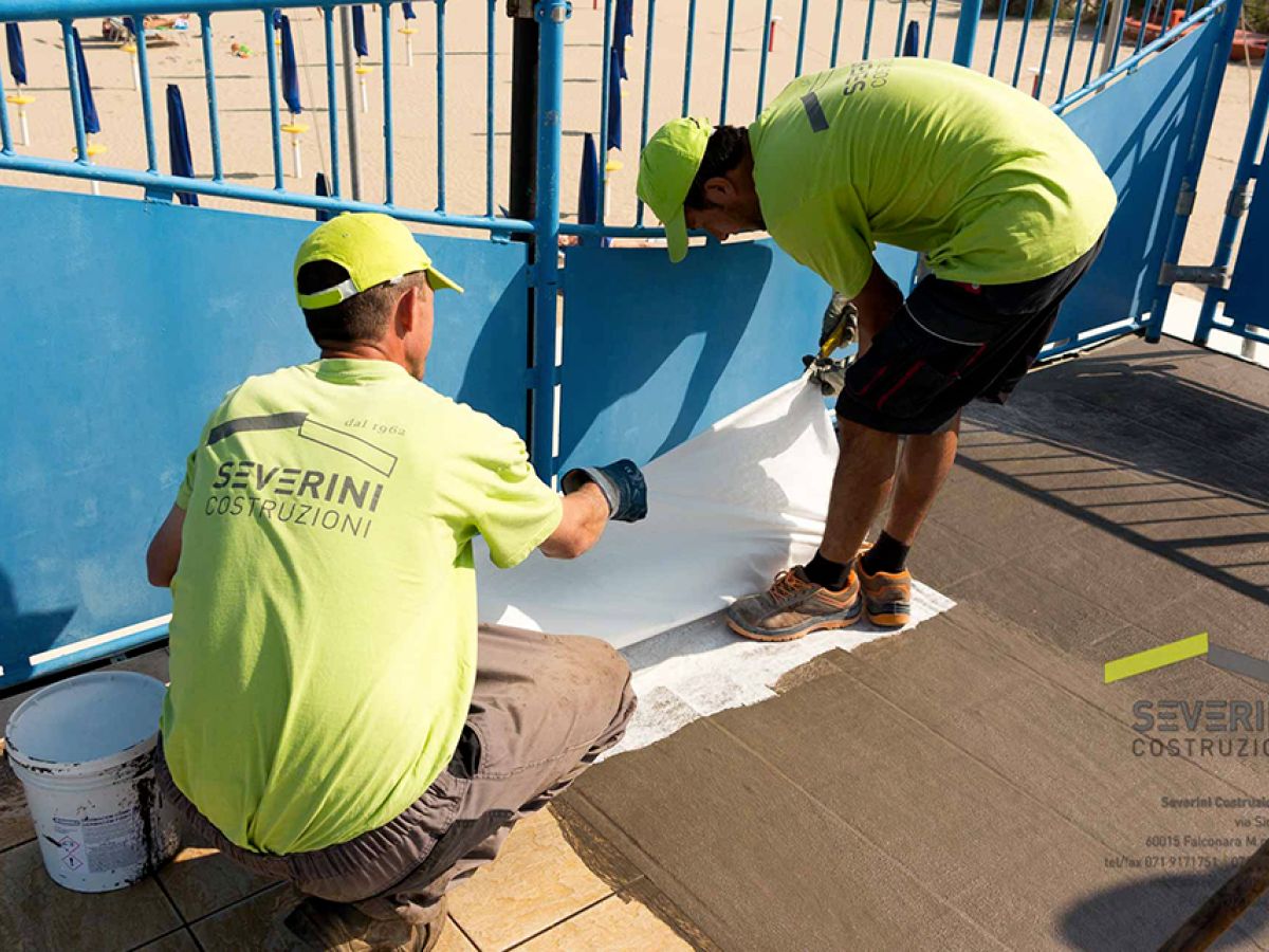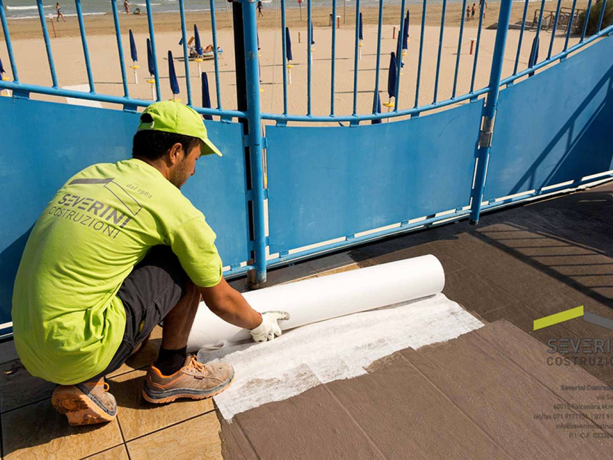 Impermeabilizzazione della copertura dello stabilimento balneare Batabanò. La Severini Costruzioni posa il telo e la guaina. I dettagli sono importanti: buona tecnica e buoni materiali fanno si che un lavoro possa durare nel tempo!